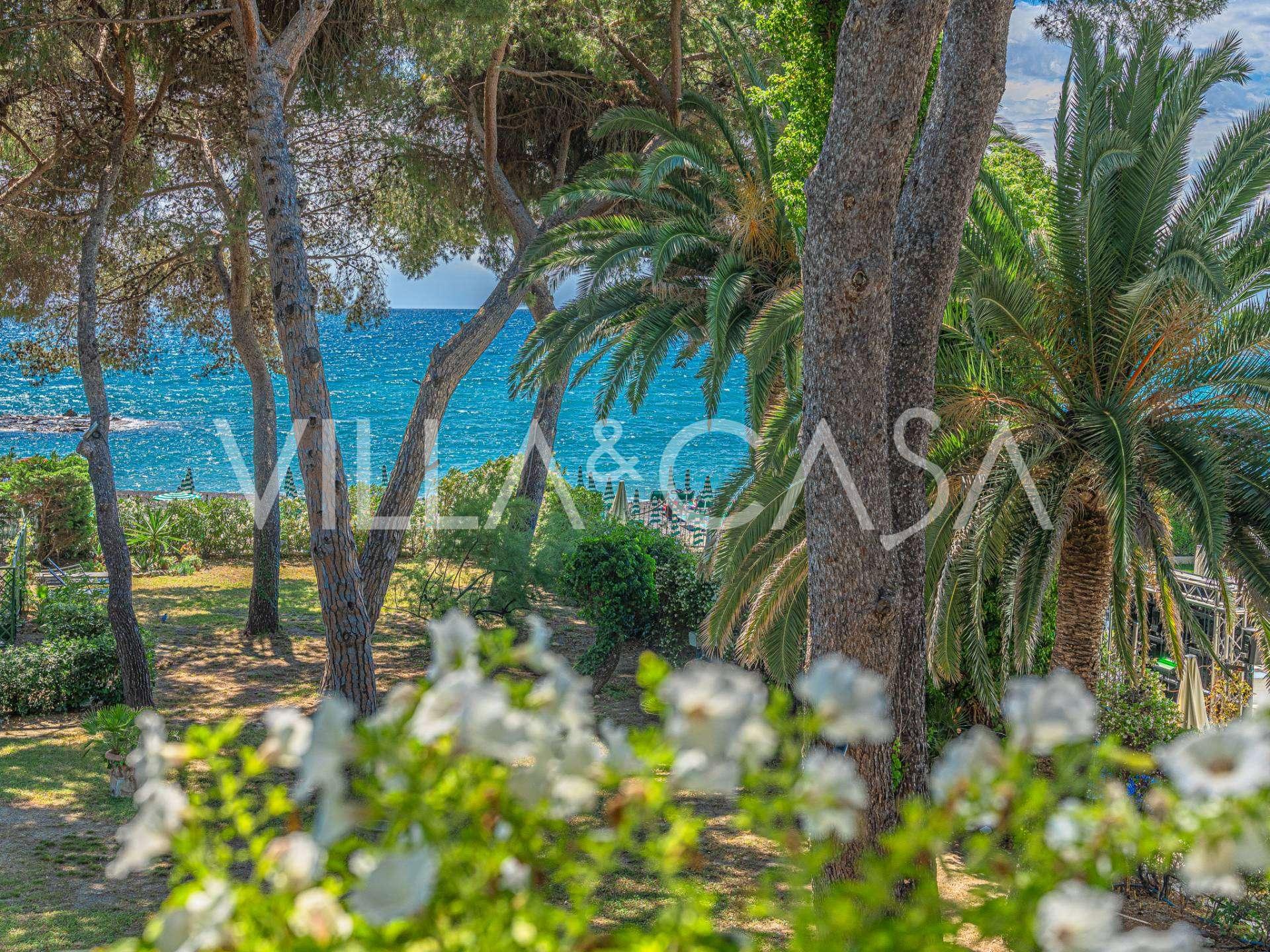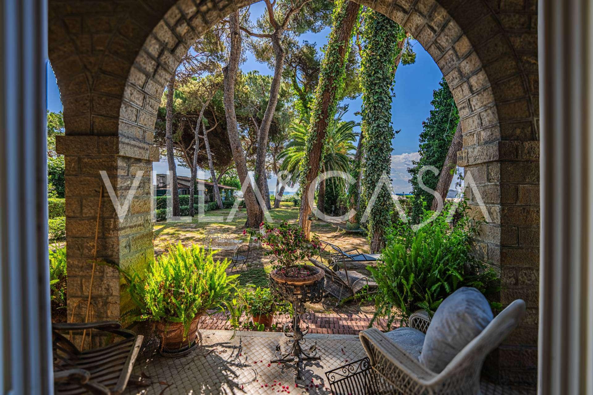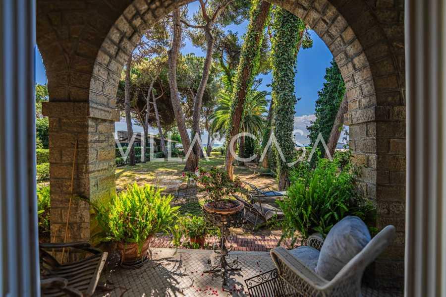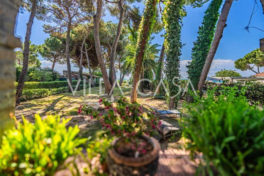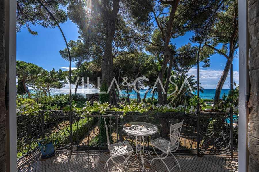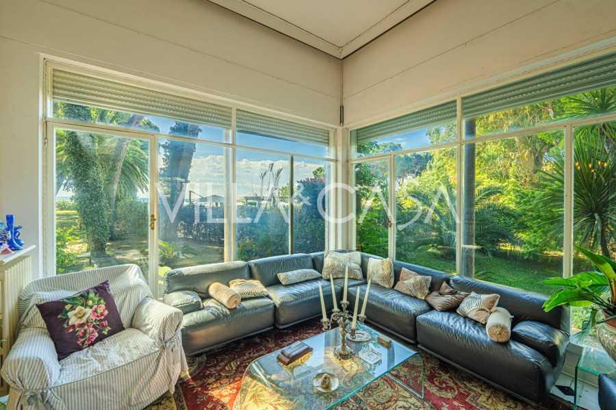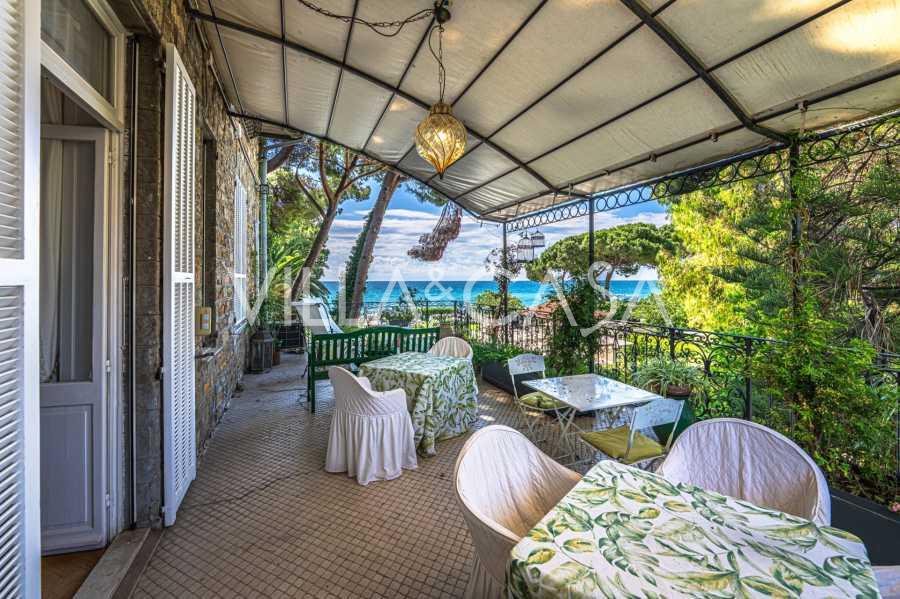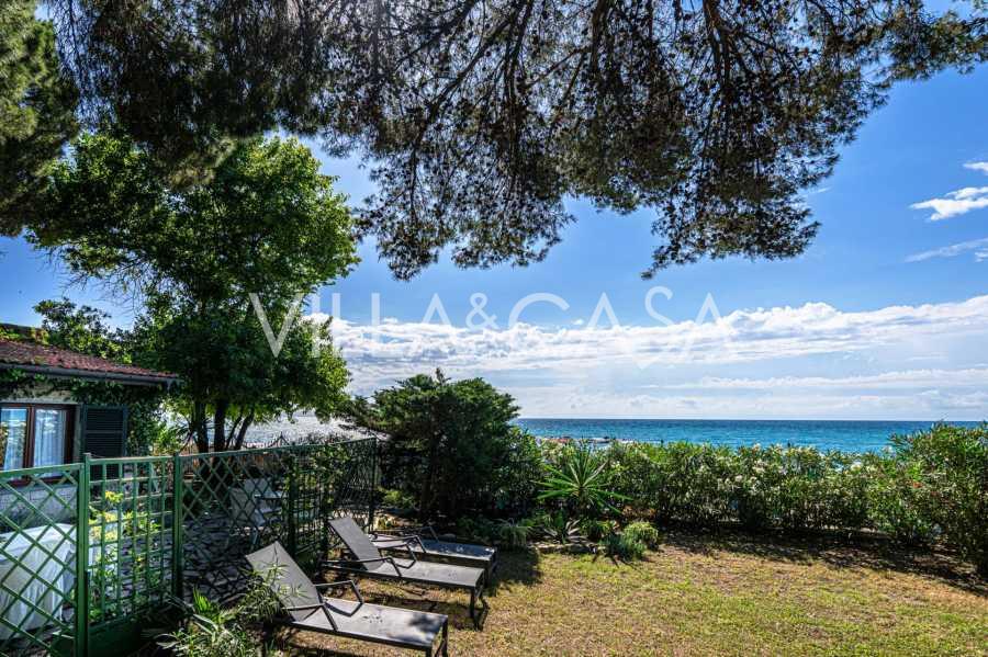 Πωλείται κομψή βίλα στην πρώτη γραμμή παραλίας στο Ντιάνο Μαρίνα, σχεδιασμένη σε αγγλικό στυλ, με έκταση περίπου 628 τ.μ., κατανεμημένη σε τέσσερα επίπεδα. Διαθέτει άμεση πρόσβαση στη θάλασσα και την αμμώδη παραλία. Η βίλα περιβάλλεται από εκτεταμένο πάρκο περίπου 5000 τ.μ. με αιωνόβια μεσογειακά έλατα.