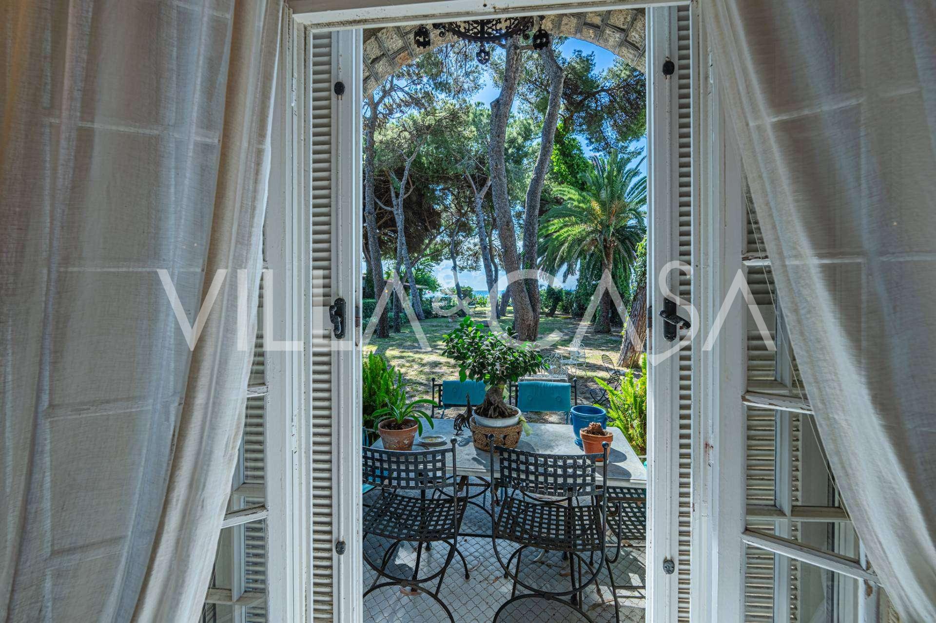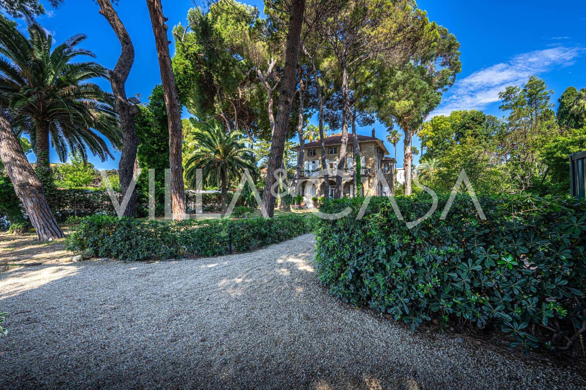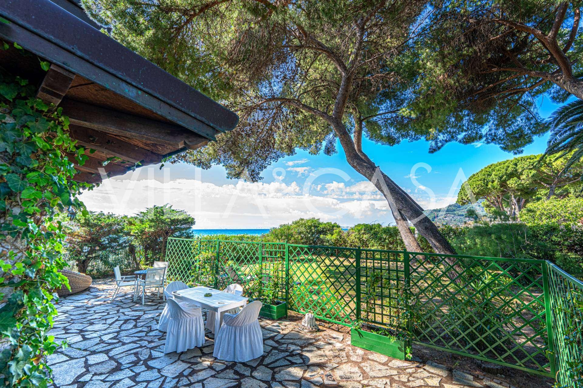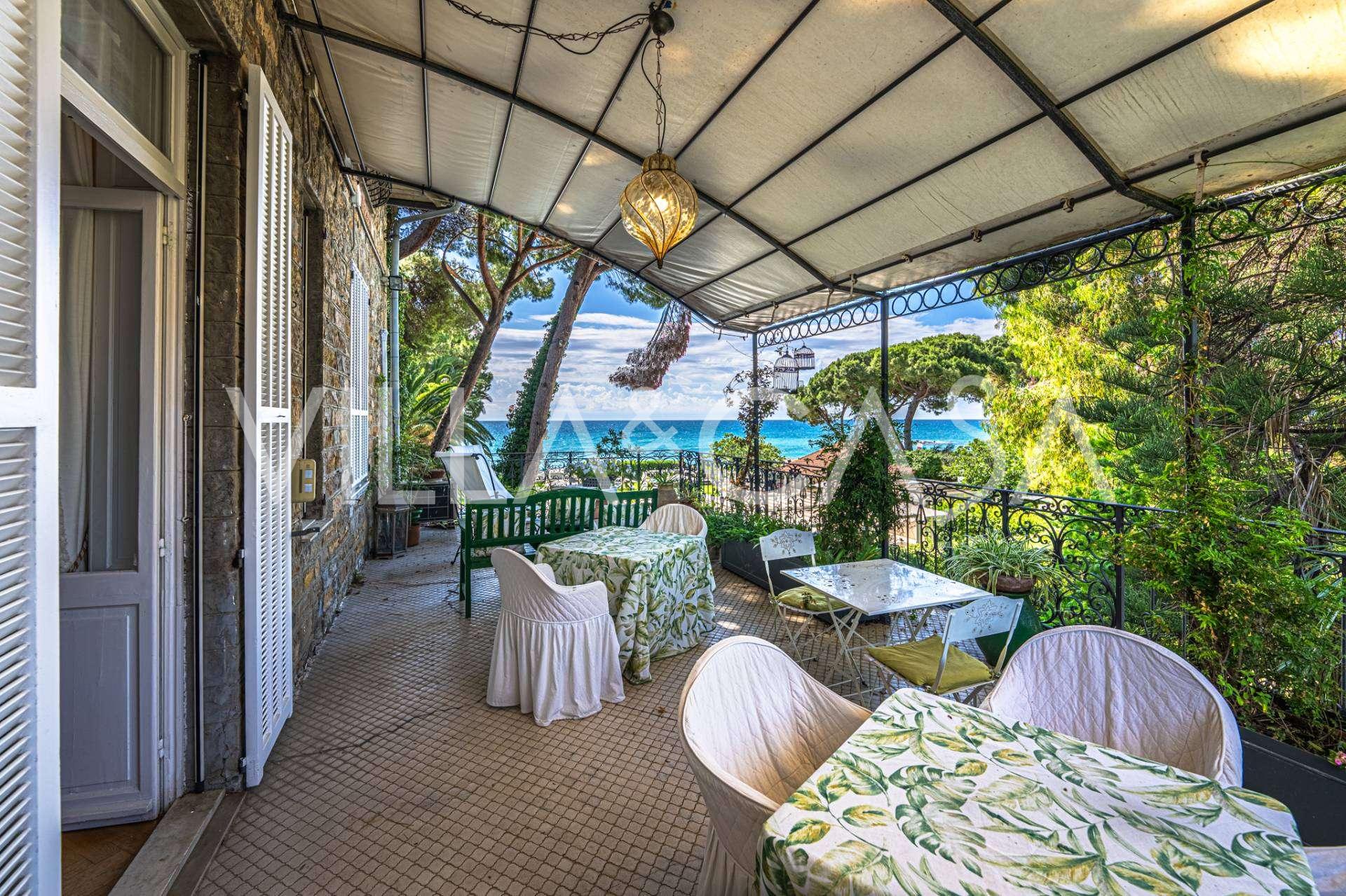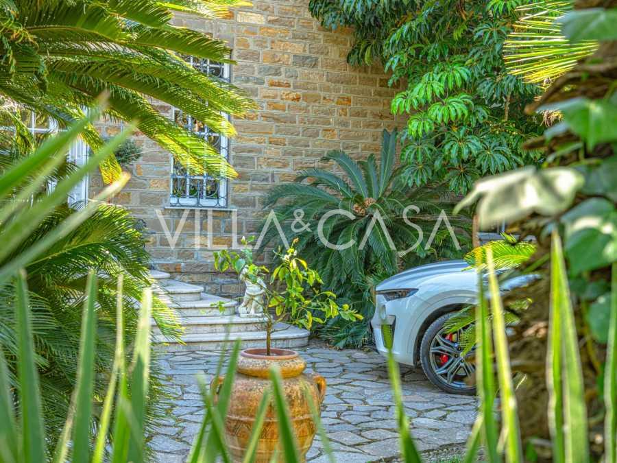 Πωλείται κομψή βίλα στην πρώτη γραμμή παραλίας στο Ντιάνο Μαρίνα, σχεδιασμένη σε αγγλικό στυλ, με έκταση περίπου 628 τ.μ., κατανεμημένη σε τέσσερα επίπεδα. Διαθέτει άμεση πρόσβαση στη θάλασσα και την αμμώδη παραλία. Η βίλα περιβάλλεται από εκτεταμένο πάρκο περίπου 5000 τ.μ. με αιωνόβια μεσογειακά έλατα.