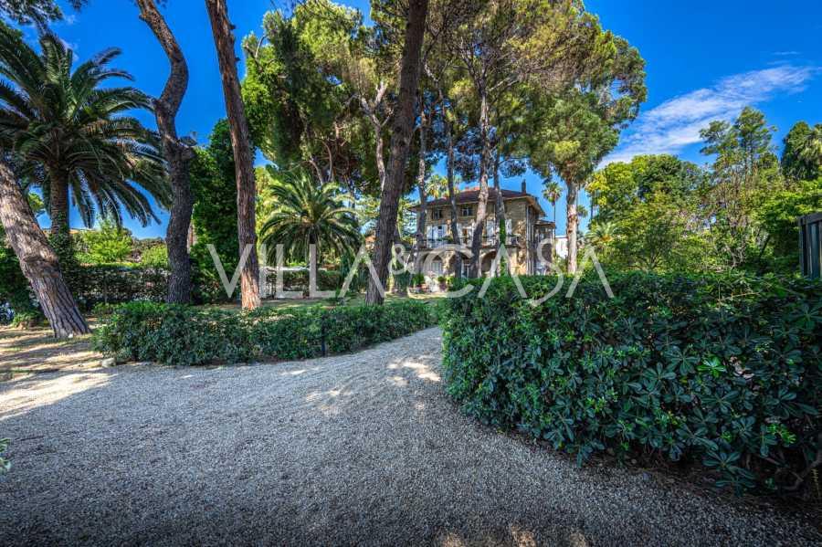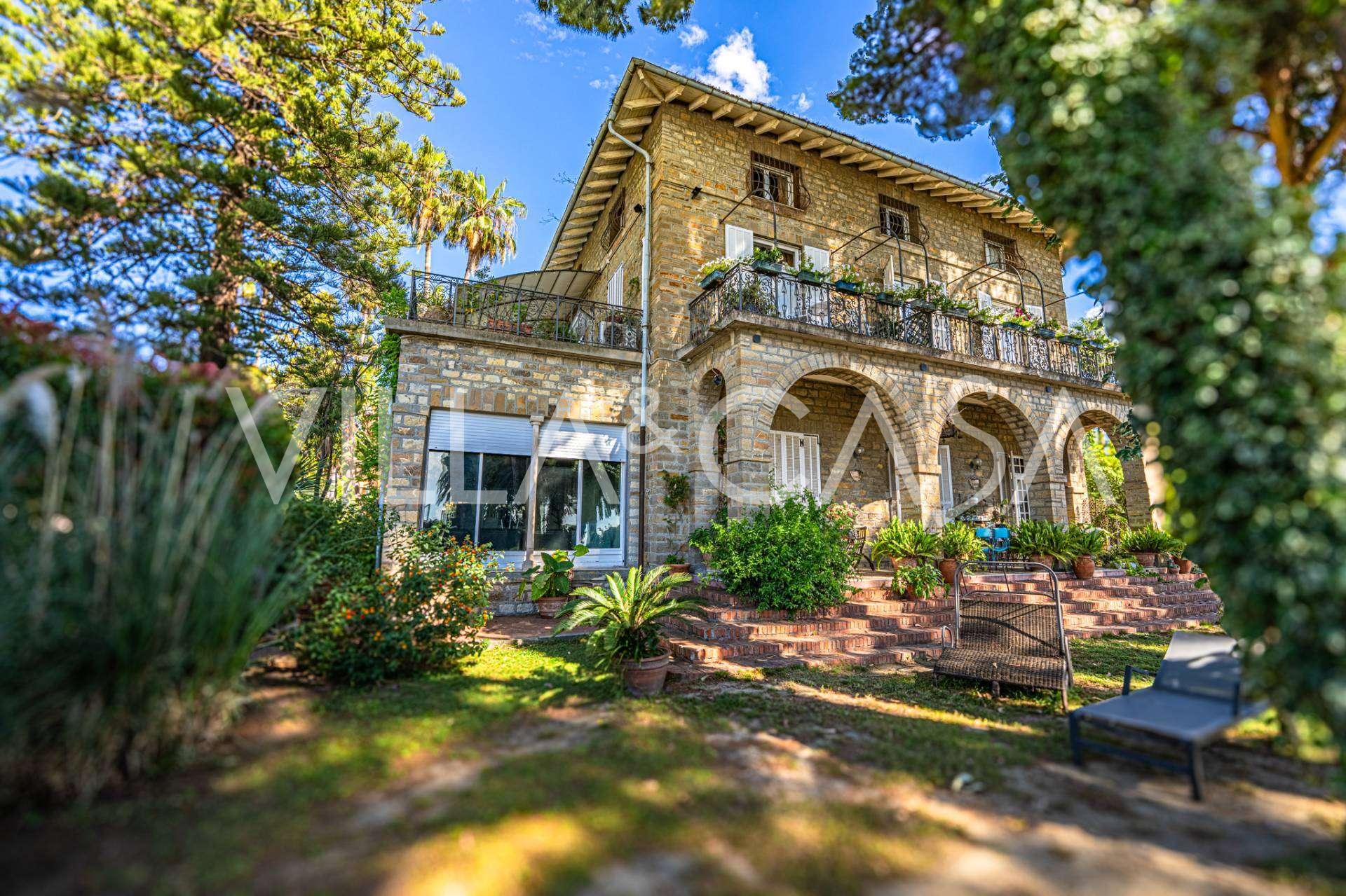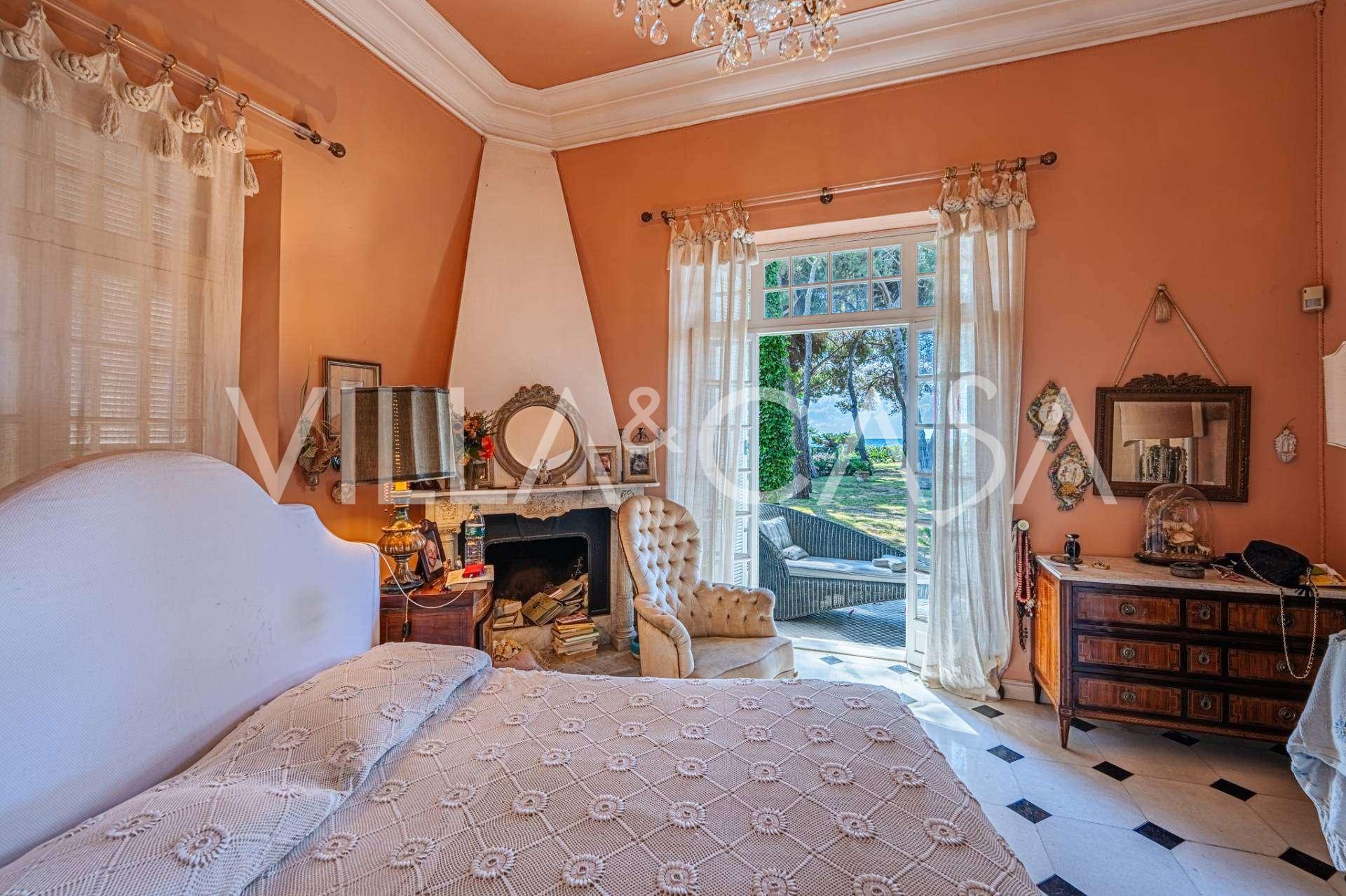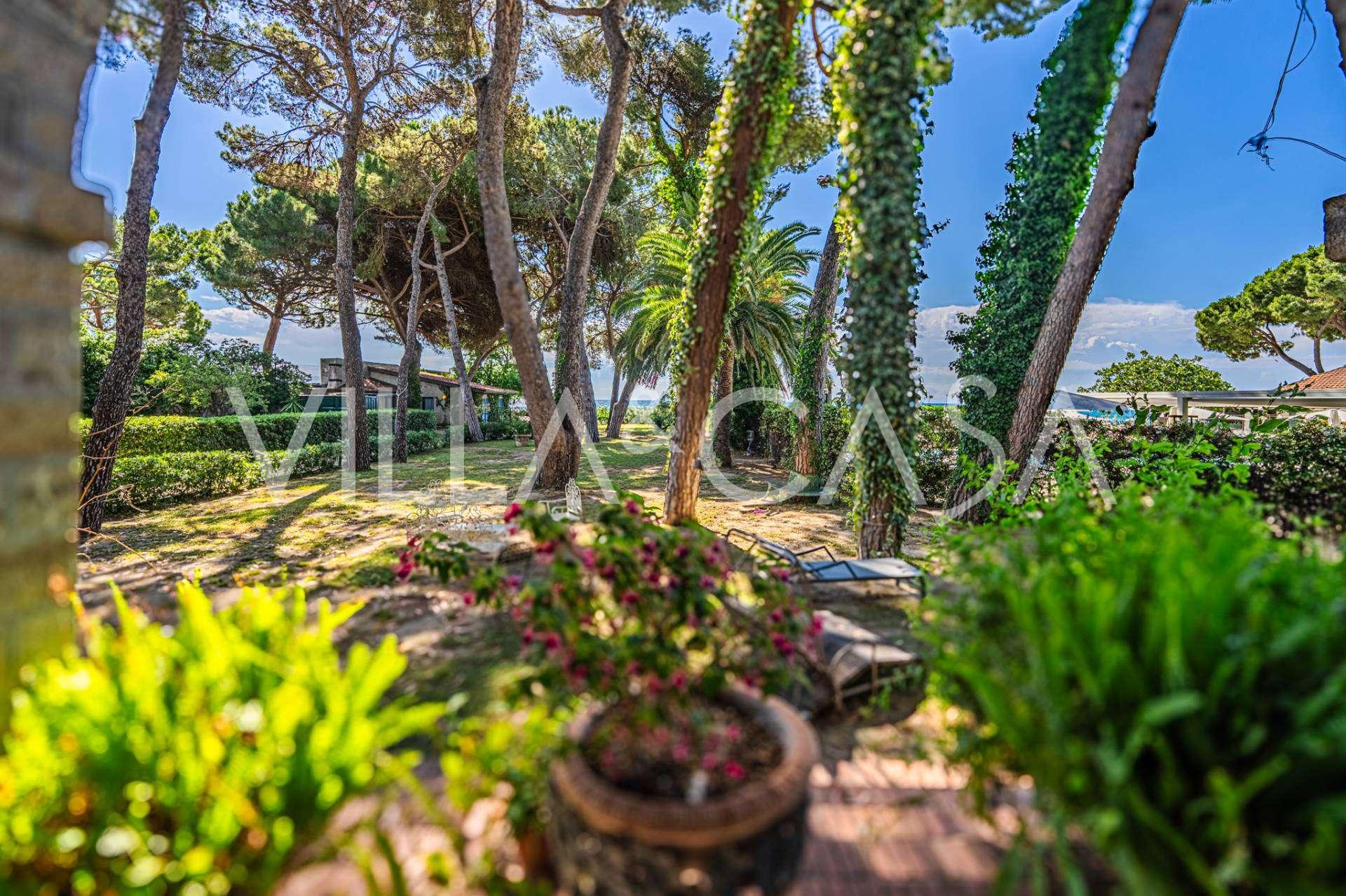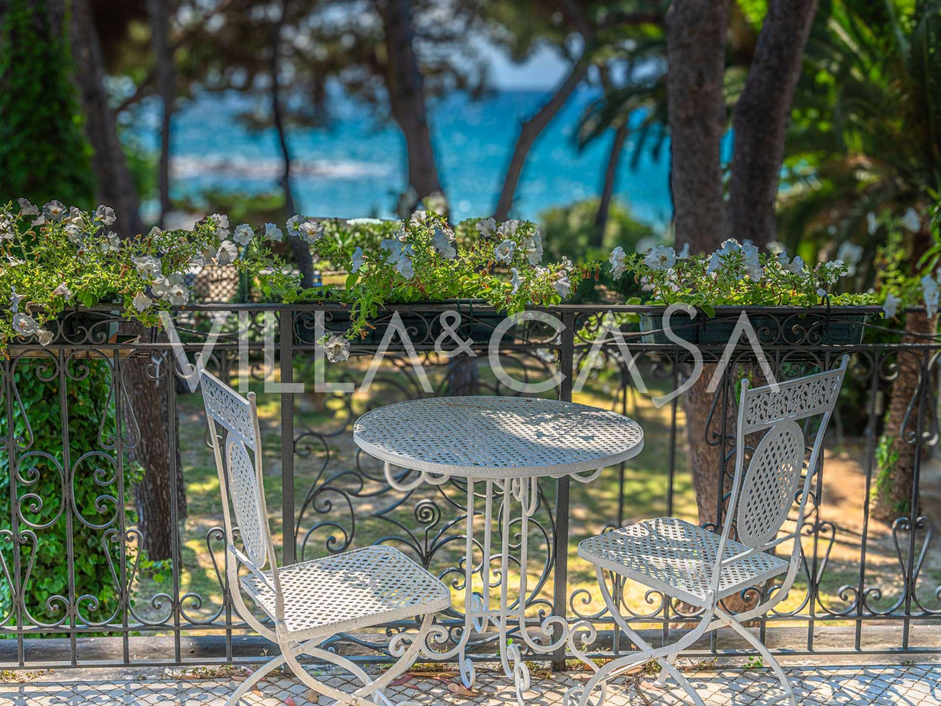 Πωλείται κομψή βίλα στην πρώτη γραμμή παραλίας στο Ντιάνο Μαρίνα, σχεδιασμένη σε αγγλικό στυλ, με έκταση περίπου 628 τ.μ., κατανεμημένη σε τέσσερα επίπεδα. Διαθέτει άμεση πρόσβαση στη θάλασσα και την αμμώδη παραλία. Η βίλα περιβάλλεται από εκτεταμένο πάρκο περίπου 5000 τ.μ. με αιωνόβια μεσογειακά έλατα.