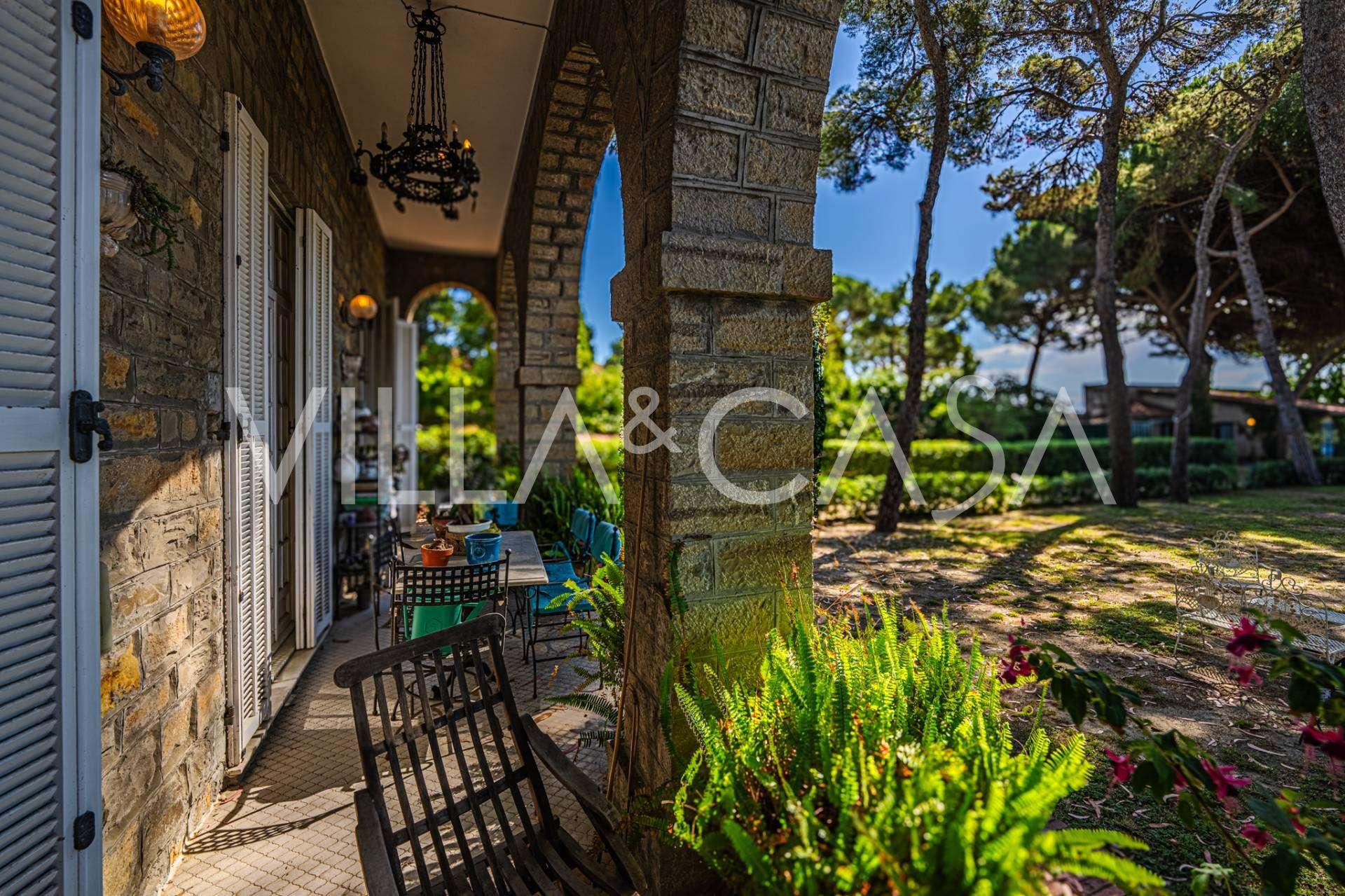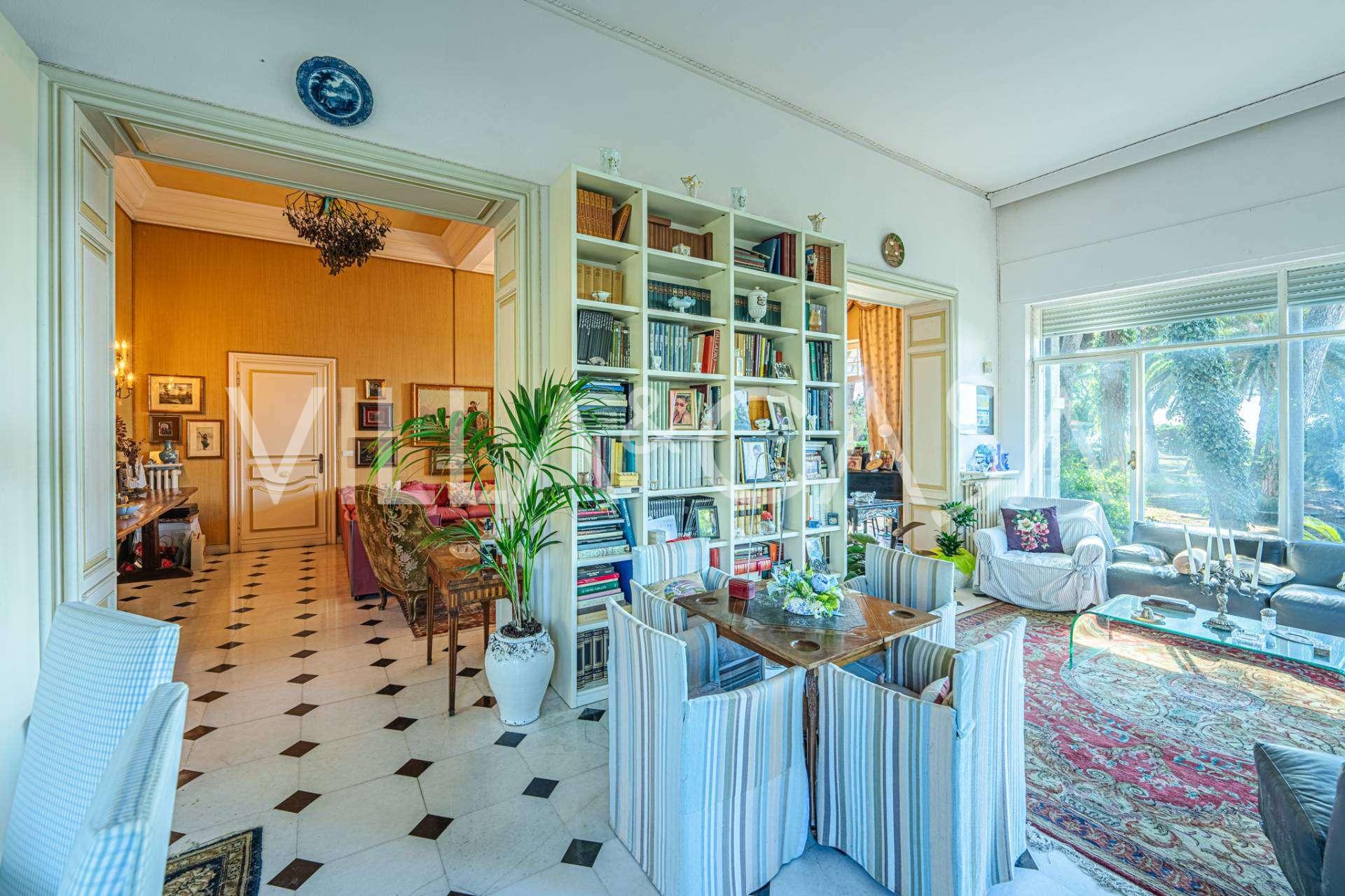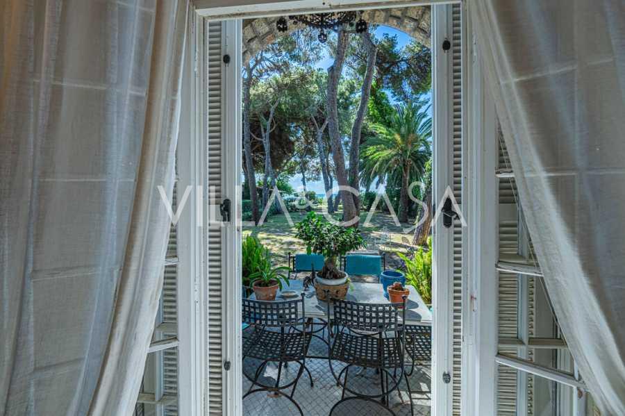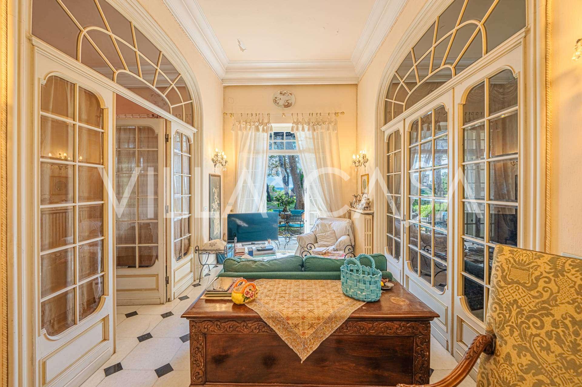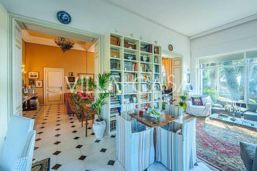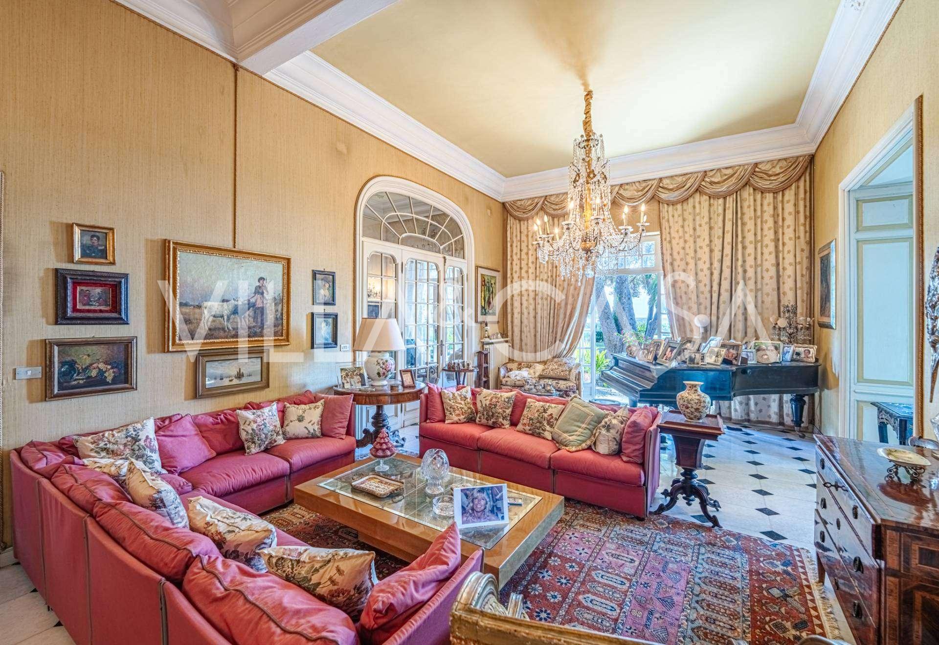 Πωλείται κομψή βίλα στην πρώτη γραμμή παραλίας στο Ντιάνο Μαρίνα, σχεδιασμένη σε αγγλικό στυλ, με έκταση περίπου 628 τ.μ., κατανεμημένη σε τέσσερα επίπεδα. Διαθέτει άμεση πρόσβαση στη θάλασσα και την αμμώδη παραλία. Η βίλα περιβάλλεται από εκτεταμένο πάρκο περίπου 5000 τ.μ. με αιωνόβια μεσογειακά έλατα.
