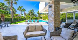 Ο κήπος της βίλας, διακοσμημένος με φοίνικες, σιντριβάνι με νυχτερινό φωτισμό και ευρύχωρη ζώνη χαλάρωσης, προσφέρει ιδανικές συνθήκες για φιλοξενία επισκεπτών και βραδιές στον καθαρό αέρα δίπλα στην πισίνα ή στη σκιερή λότζια.