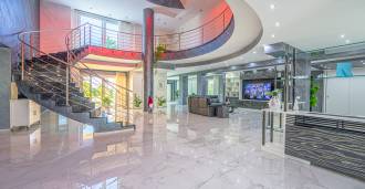 Η σύγχρονη κατοικία, έκτασης περίπου 2000 τ.μ., εκτείνεται σε δύο επίπεδα, τα οποία συνδέονται με εσωτερικό ανελκυστήρα και κυκλική σκάλα. Οι ευρύχωροι και φωτεινοί χώροι περιλαμβάνουν πέντε κομψά υπνοδωμάτια και εννέα μπάνια, διακοσμημένα με υλικά υψηλής ποιότητας που υπογραμμίζουν το κύρος των εσωτερικών χώρων.
