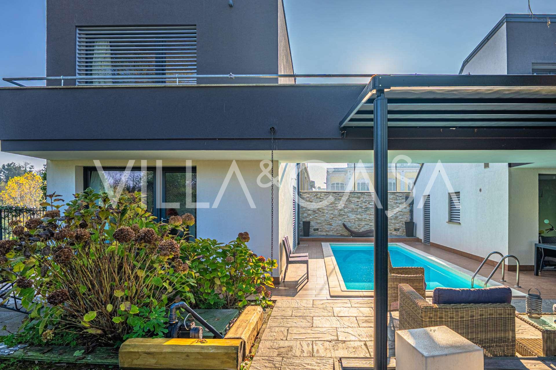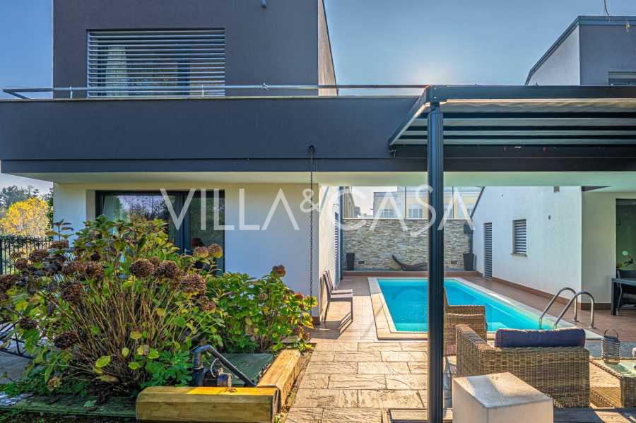 Στην καρδιά της πόλης της Φερράρα, περιτριγυρισμένο από καλοδιατηρημένο πράσινο, προσφέρεται προς πώληση ένα σύγχρονο σπίτι, χτισμένο το 2014, με συνολική επιφάνεια περίπου 360 τ.μ. Είναι χωρισμένο σε δύο ανεξάρτητα μέρη: το κύριο σπίτι και έναν ξεχωριστό ξενώνα. Αυτά συνδέονται με μια ευρύχωρη κοινή βεράντα στον δεύτερο όροφο, δημιουργώντας την αίσθηση ενός ενιαίου χώρου και προσφέροντας υπέροχη θέα στον κήπο και την περιοχή αναψυχής.