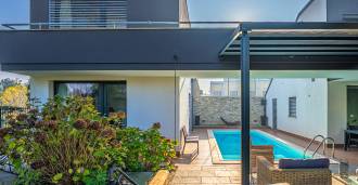 Στην περιοχή υπάρχει καλοδιατηρημένος κήπος, μεγάλη ανοιχτή πισίνα, γκαράζ και 4 σκεπαστές θέσεις στάθμευσης, περιοχή μπάρμπεκιου και αρκετές βεράντες για χαλάρωση στον καθαρό αέρα, μία από τις οποίες είναι σκεπαστή για άνετη παραμονή ακόμα και σε κακές καιρικές συνθήκες.
