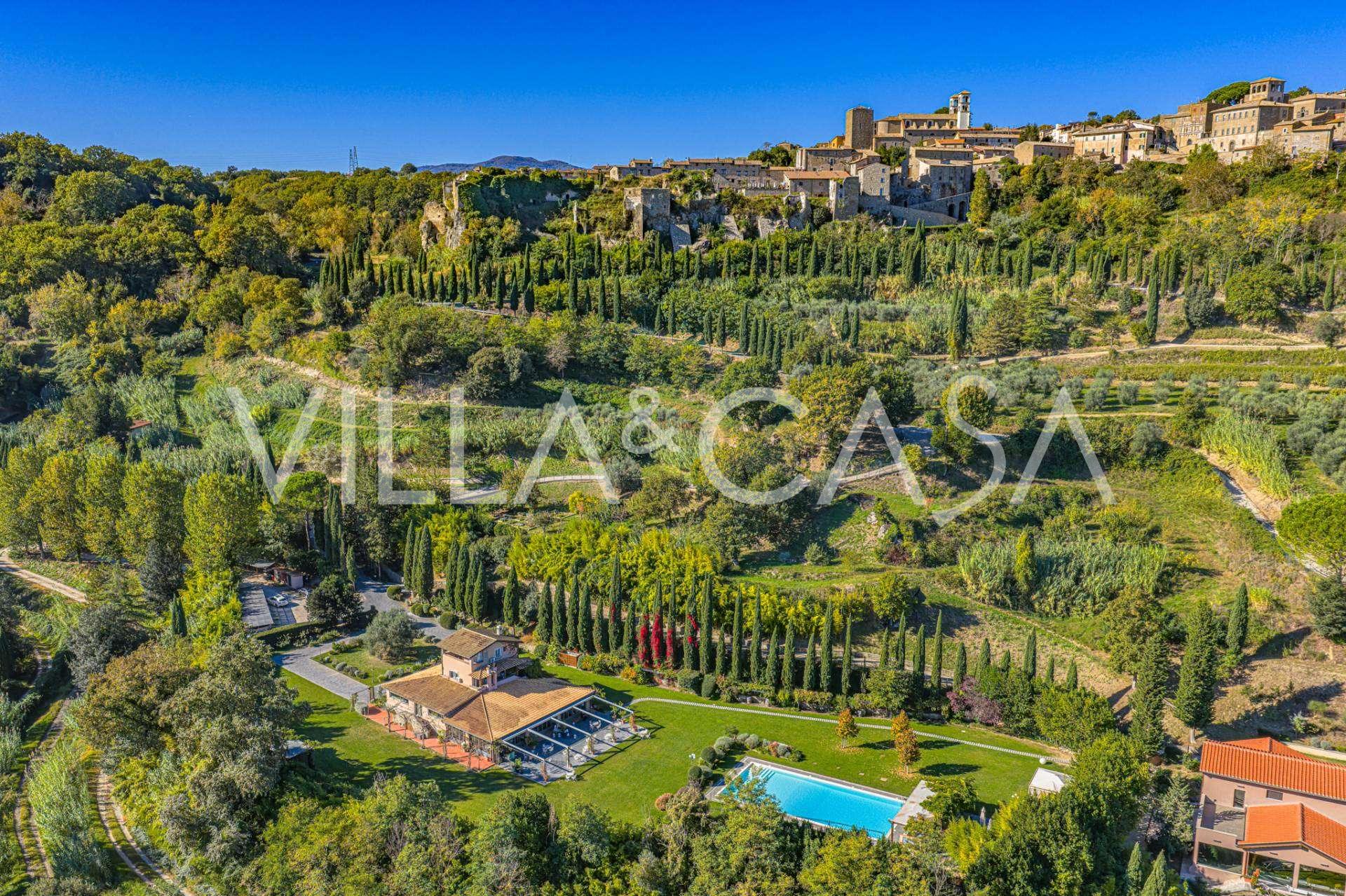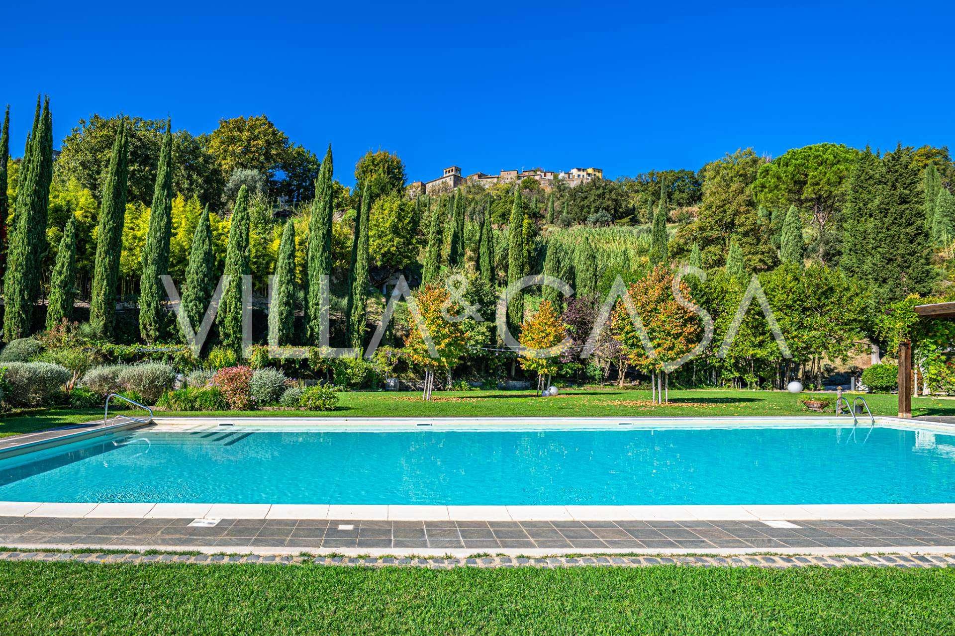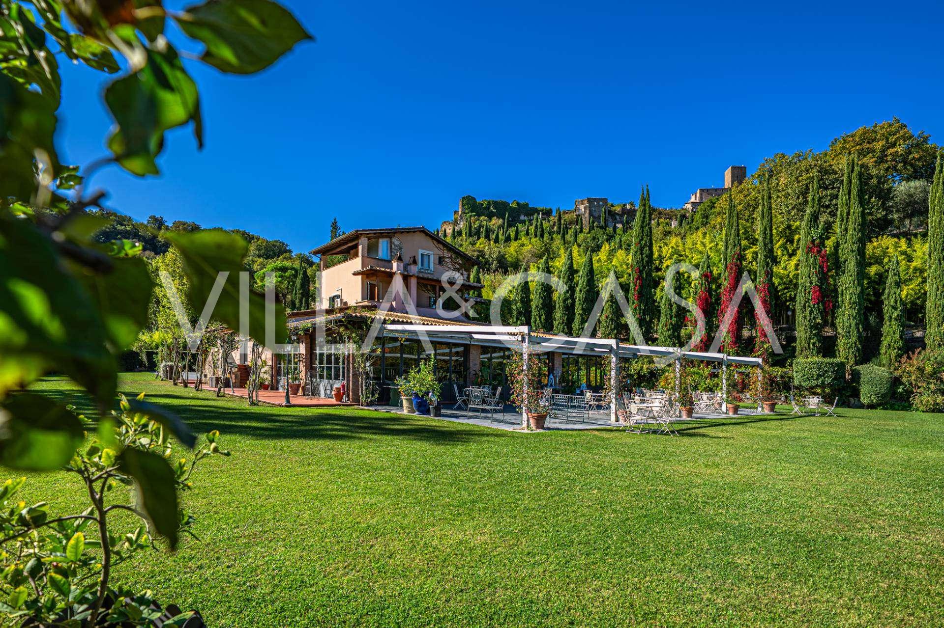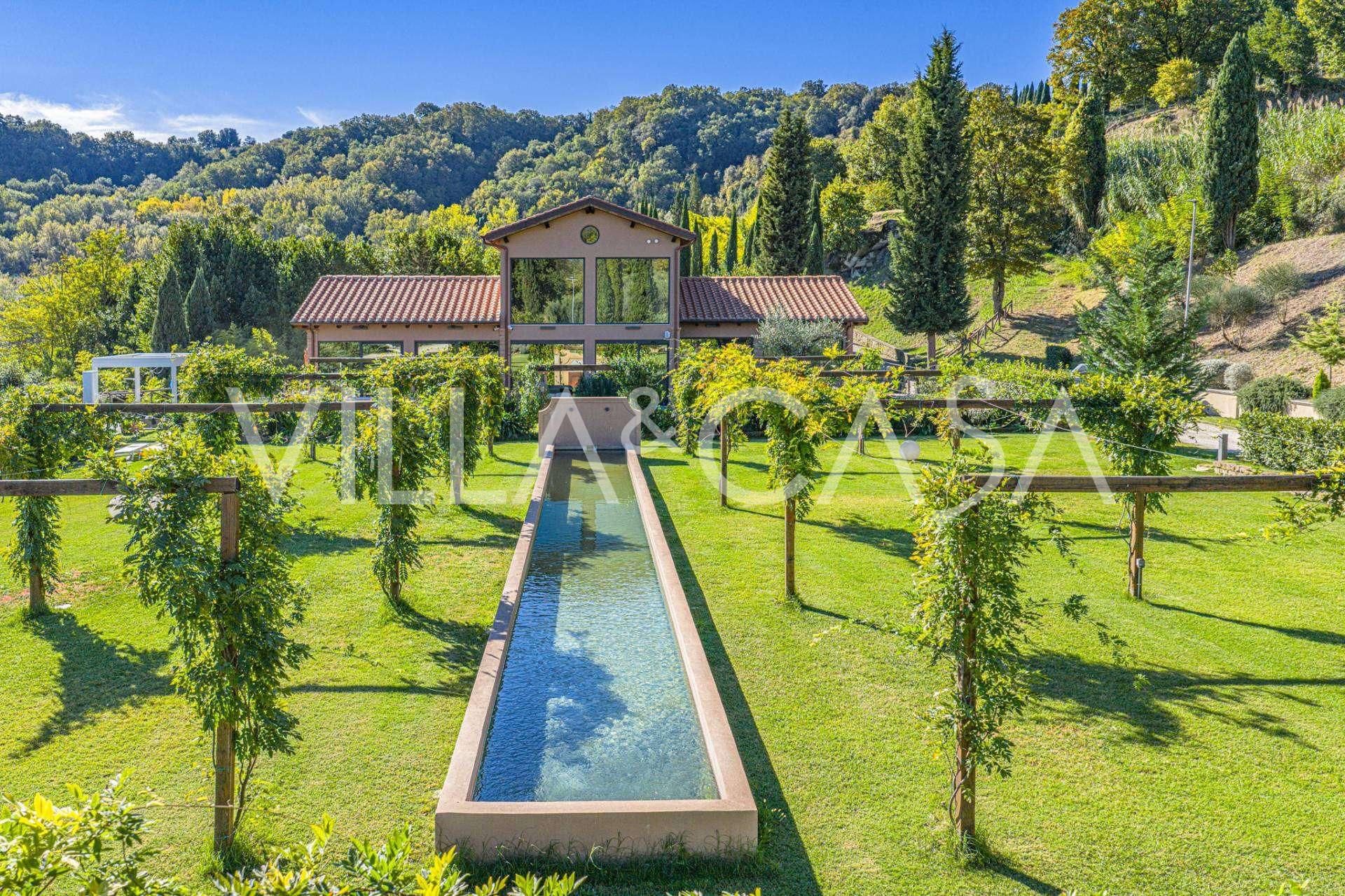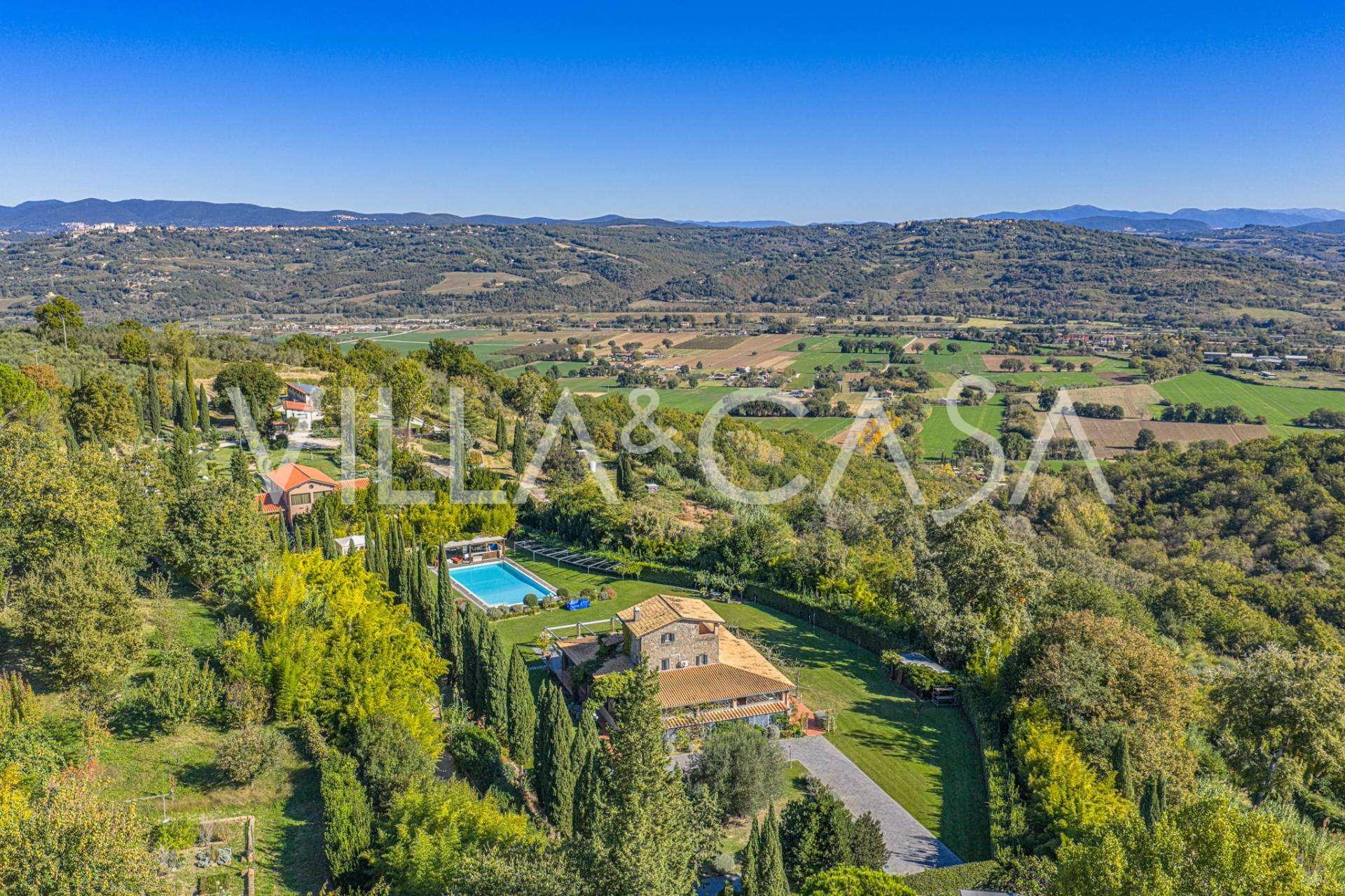 Στην επαρχία του Βιτέρμπο, στην κορυφή των λόφων, ανοίγεται μια εκπληκτική θέα στην κοιλάδα του Τίβερη. Το κτήμα καταλαμβάνει περίπου 25 εκτάρια καλοδιατηρημένου πάρκου, δημιουργώντας μια ατμόσφαιρα απόλυτης ηρεμίας και απομόνωσης. Κάθε γωνιά έχει σχεδιαστεί για άνεση, κομψότητα και αρμονία: ηλιόλουστες βεράντες, κιόσκια, κομψές ξαπλώστρες δίπλα στην πισίνα και σκιερές λεωφόροι, περιτριγυρισμένες από αιωνόβια δέντρα.