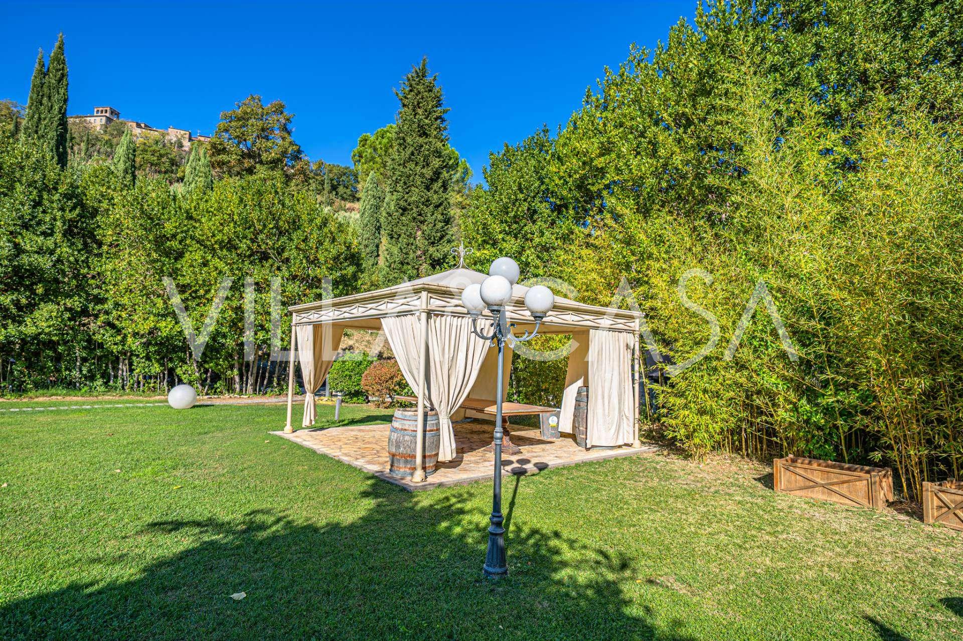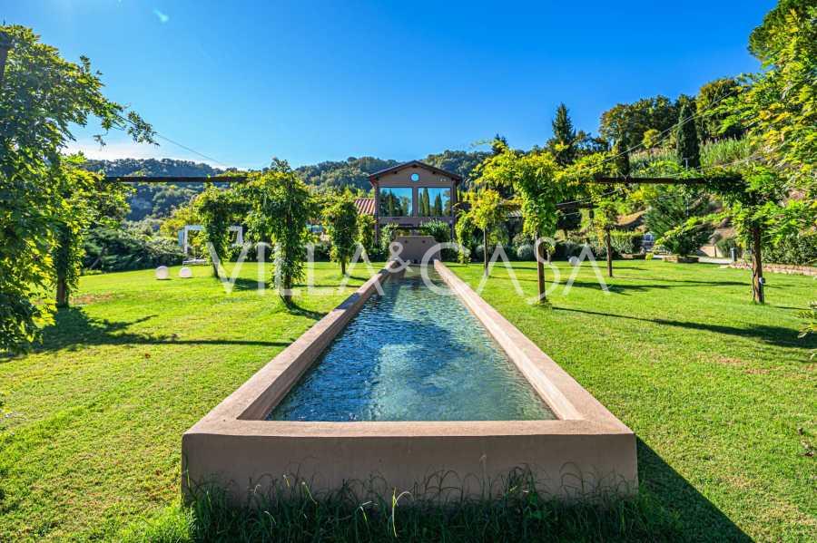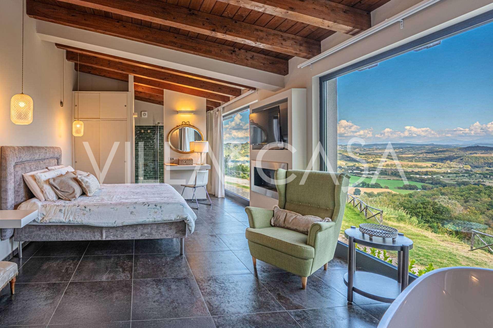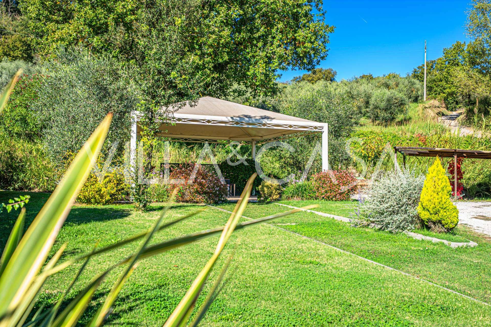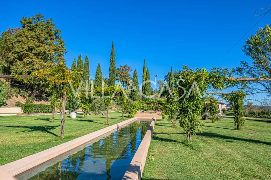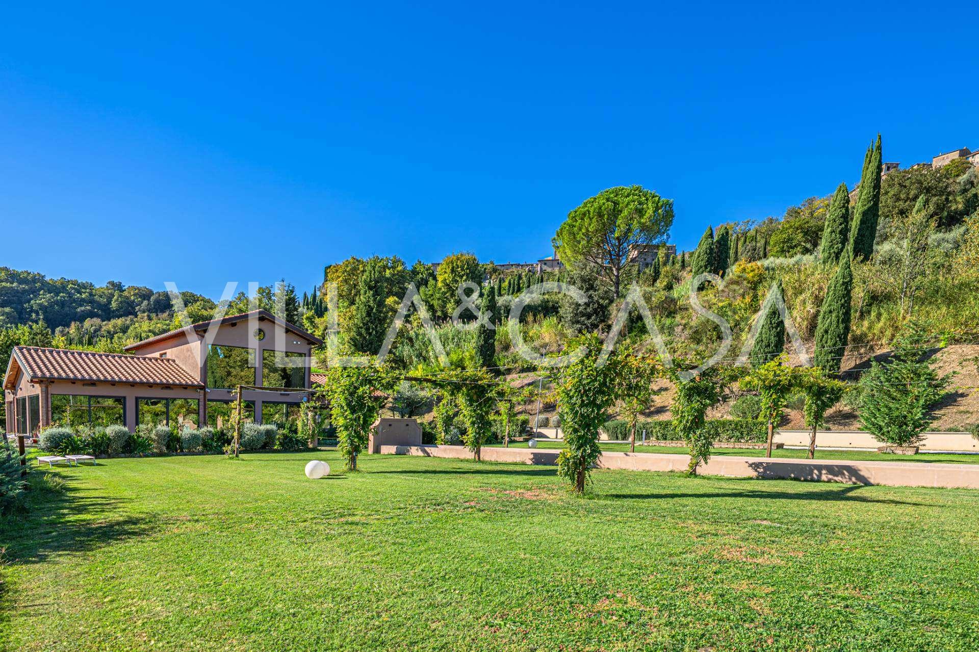 Στην επαρχία του Βιτέρμπο, στην κορυφή των λόφων, ανοίγεται μια εκπληκτική θέα στην κοιλάδα του Τίβερη. Το κτήμα καταλαμβάνει περίπου 25 εκτάρια καλοδιατηρημένου πάρκου, δημιουργώντας μια ατμόσφαιρα απόλυτης ηρεμίας και απομόνωσης. Κάθε γωνιά έχει σχεδιαστεί για άνεση, κομψότητα και αρμονία: ηλιόλουστες βεράντες, κιόσκια, κομψές ξαπλώστρες δίπλα στην πισίνα και σκιερές λεωφόροι, περιτριγυρισμένες από αιωνόβια δέντρα.