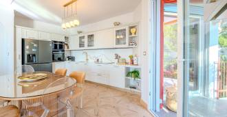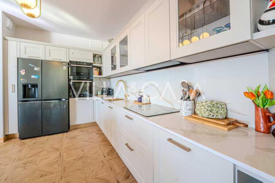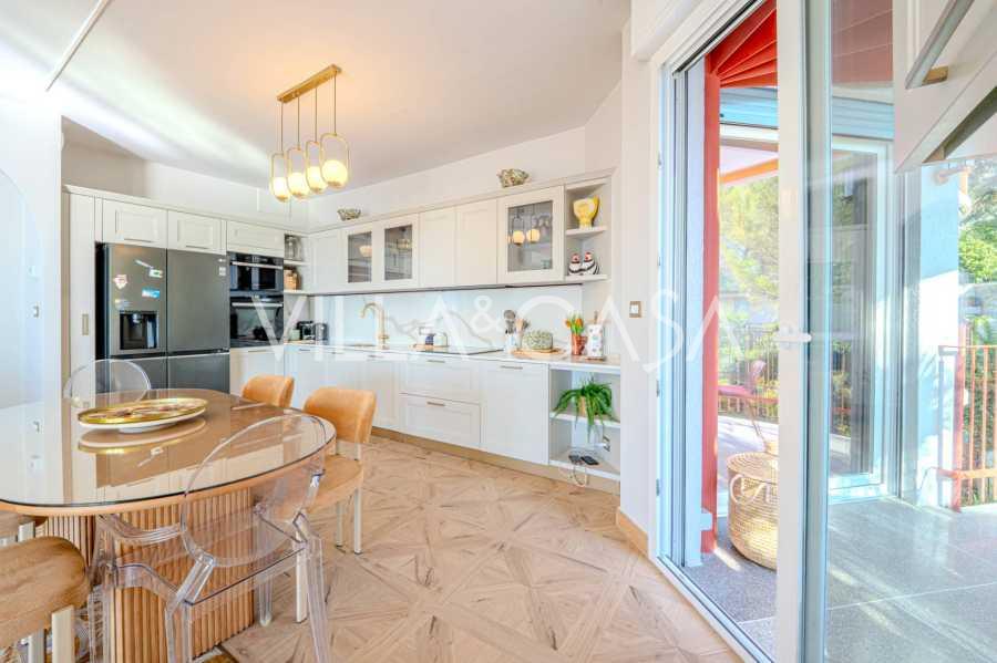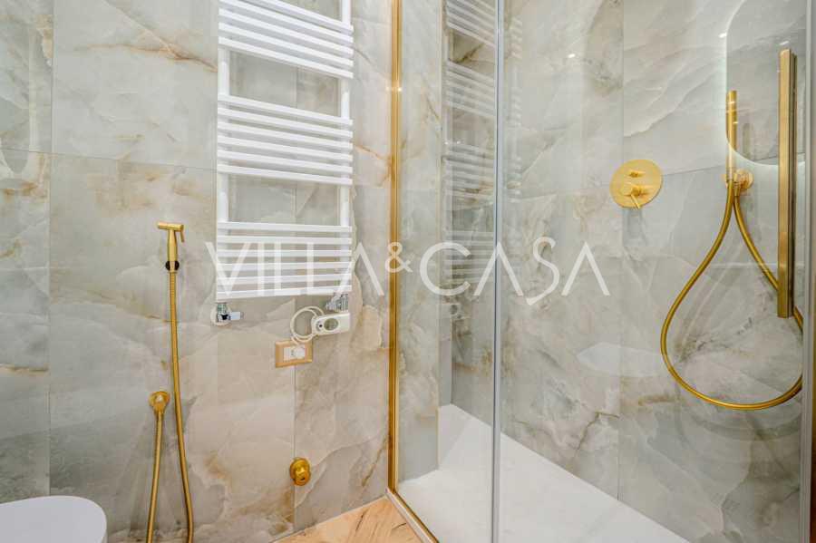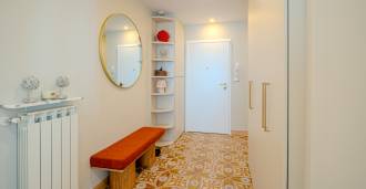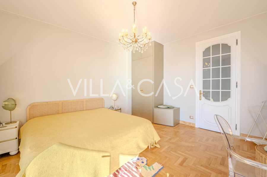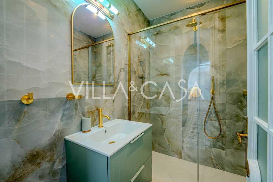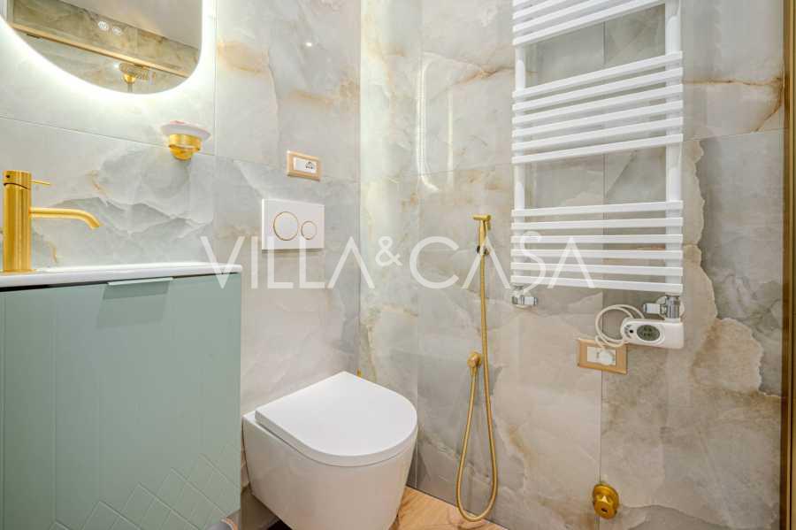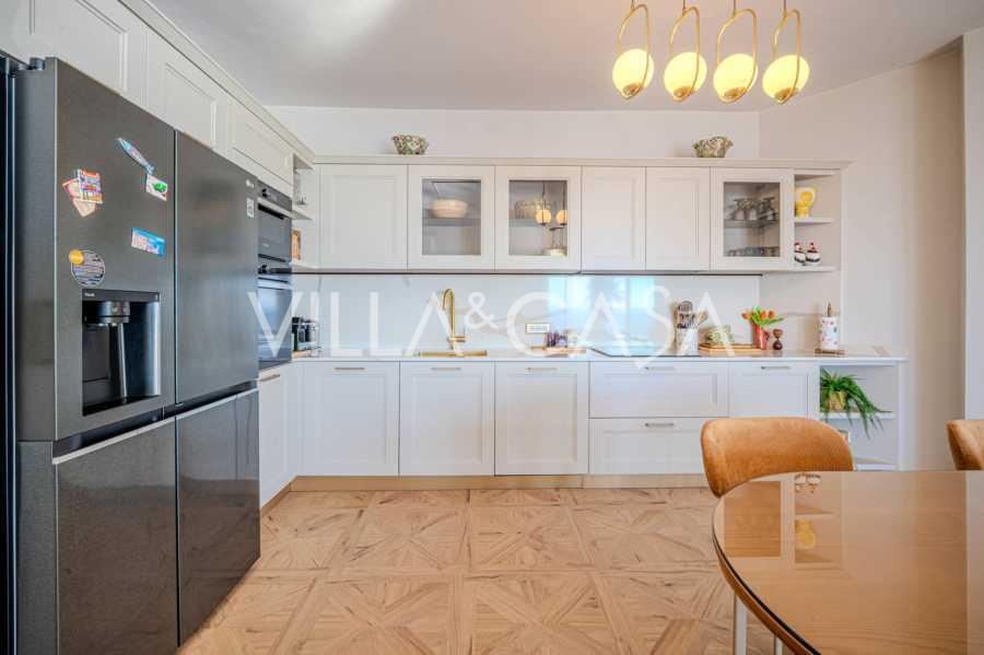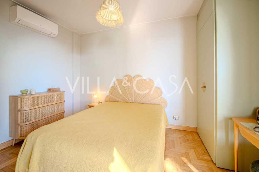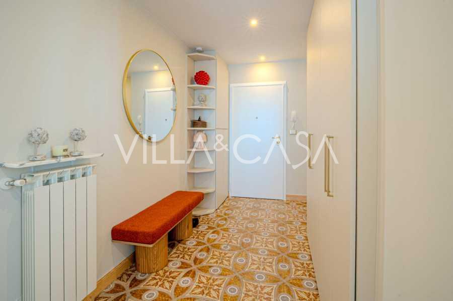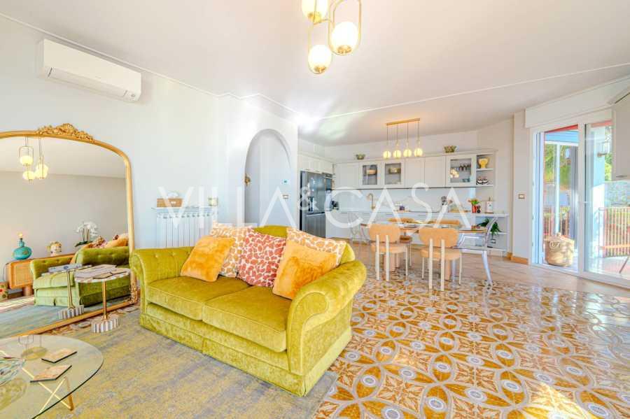 Η εσωτερική διακόσμηση του διαμερίσματος συνδυάζει τη σύγχρονη άνεση με την ατμόσφαιρα της κομψής θαλπωρής. Ένας ευρύχωρος διάδρομος οδηγεί στο υπέροχο σαλόνι με ανοιχτή κουζίνα, από την οποία ανοίγεται μαγευτική θέα στη θάλασσα. Από το σαλόνι υπάρχει πρόσβαση σε δύο μπαλκόνια, όπου μπορείτε να απολαύσετε τη θαλασσινή αύρα και τη θέα στην ακτή της Λιγουρίας.